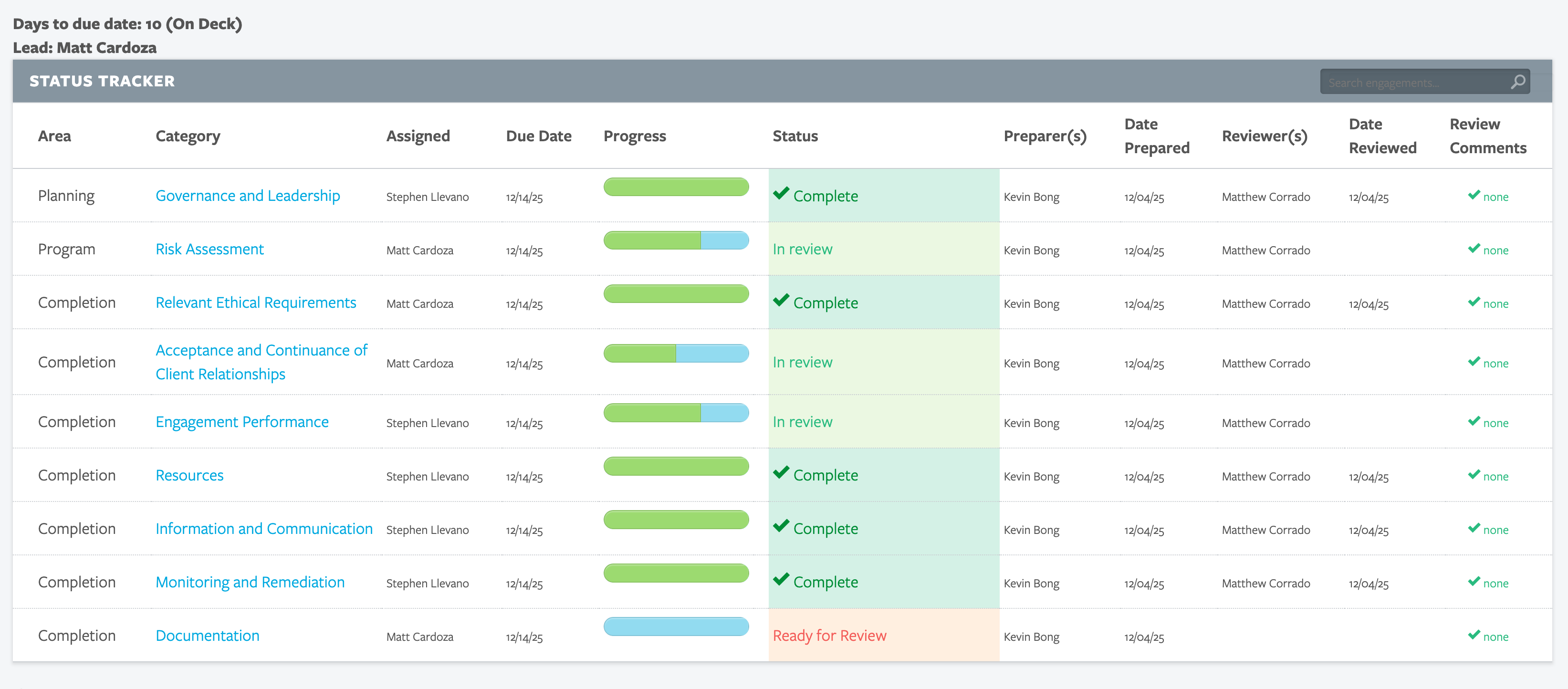 Status TrackerThe Status Tracker page, accessible from the Summary section of an Engagement, provides a summary-level view of who signed off and sign off type for all procedures by category in one view.UPDATE: Users can now see a high-level status (in progress, ready for review, etc.) of each area in an engagement (Engagement Letter, Cash, etc.). Users can also access this report from the "ENGAGEMENTS" tab on the top right of the screen (see the status column with a link to open the report in a new browser tab). |